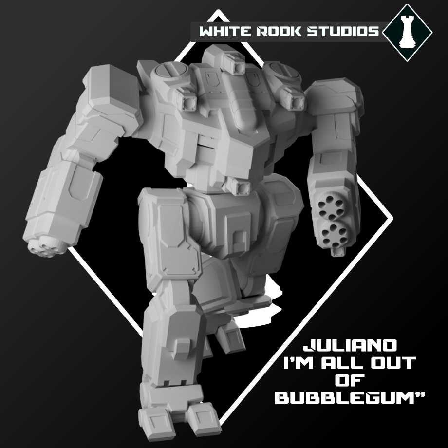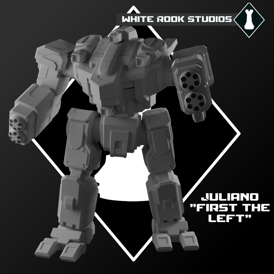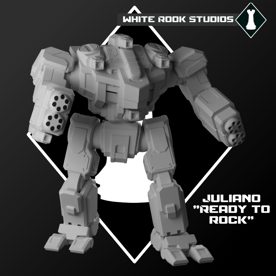 The Juliano is unusual in that it uses a mix of IS and clan tech in its construction. A Free Worlds League design, it is an all purpose mech with 16.5 tons of Light Ferro-Fibrous armor, 4 Clan Streak SRM-6 launchers, 3 ER large lasers, and 3 ERM medium lasers to give it long and medium range striking capability and the SRMs in case an enemy gets too close.